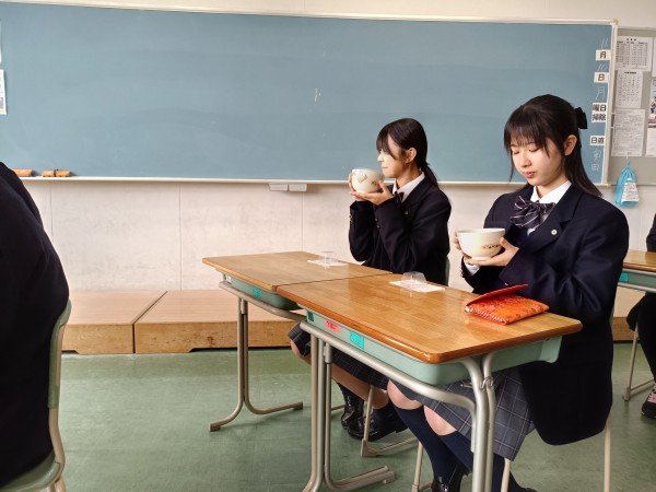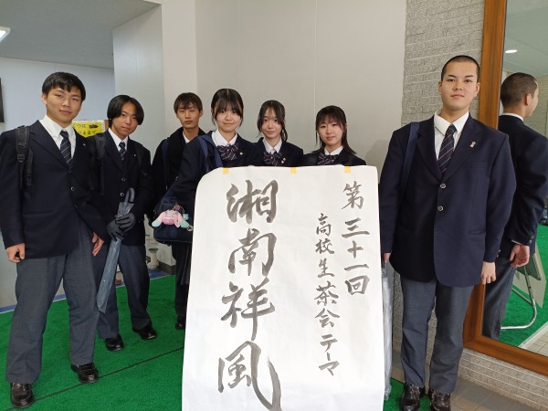 11月9日(日)、代表生徒8名が会場校の湘南工科大学附属高等学校に伺い、2席の茶会に参加、おもてなしを受けました。数多くの学校・流派の茶道部が参加する高校生茶会は、各校での創意工夫がされており、普通教室を上手に活かしてお茶会を実践していました。参加した生徒はそれぞれ出されたお菓子やお抹茶を味わい、お点前を真剣に見ていました。