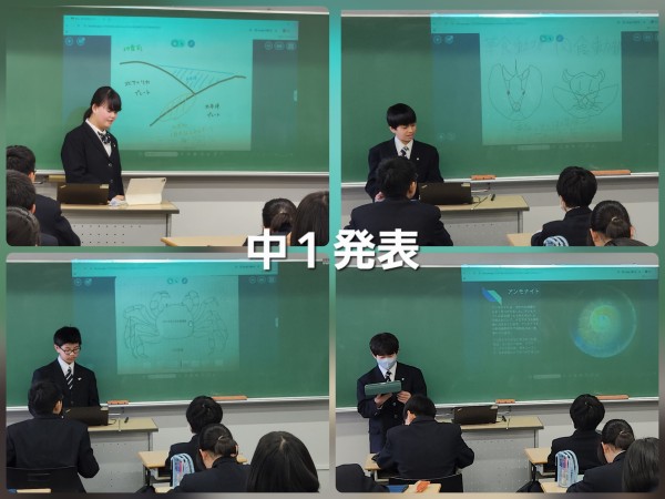 中1では、1年間を通して授業で学んだ内容(植物、動物、火山、地震、地層など)の中から生徒が1つテーマを選び、それについて深掘り調査をし、発表をしました。