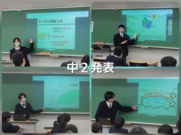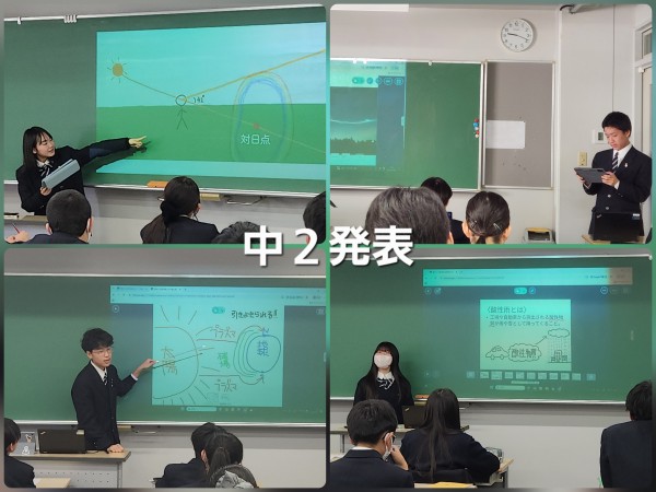 両学年ともスライド作成のルールとして、「使用する画像は手描きもしくは自身で撮影した写真のみ」とし、内容の理解に努めてもらいました。生徒にとって人前で発表することは緊張する機会となりますが、お互いに励まし合いながら、どの生徒もしっかりと発表に臨むことができました。それぞれの生徒が「先生役」を務め、教科書の内容を超えて自然現象に関する知見を深め合う、実り豊かな時間になりました。